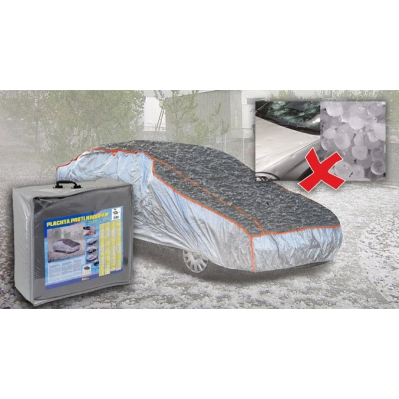 Ochranná plachta na auto proti krupobitiu, na prekrytie celého vozidla. Vysoká odolnosť proti poveternostným vplyvom, vodeodolná. Horná časť vystužená zosilneným materiálom, ktorý dokáže absorbovať nárazy krúp pri krupobití a tým zamedzí poškodeniu vozidla. Jednoduché upevnenie plachty - iba sa nasadí na automobil, na spodku sa upevní časť s všitou gumou za vhodné záhyby karosérie alebo nárazníka a prednú i zadnú časť plachty sa dôkladne upevní pomocou všitých popruhov so sponami.