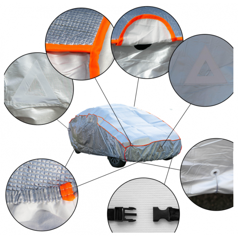 Ochráňte vaše auto voči vonkajším vplyvom s vysokokvalitnou auto plachtou značky 4CARS. Táto auto plachta účinne chráni vaše vozidlo pred poškriabaním, poškodením krupobitím, prachom, dažďom, snehom, mrazom a inými nepriaznivými poveternostnými podmienkami. Vonkajšia časť plachty je vyrobená z kvalitnej reflexnej vrstvy, ktorá chráni vašej auto pred UV žiarením produkovaným slnkom a zvyšuje ochranu viditeľnosti vášho vozidla aj v noci. Vnútorná časť plachty je vyrobená z pevného a vode odolného PVC materiálu s hrúbkou 5mm, ktorá zabraňuje pretrhnutiu plachty a prepusteniu vody. Auto plachta je nenáročná na montáž. Plachta je vybavená otvormi, ktoré umožňujú plachtu pripevniť pomocou pribaleného lanka s možnosťou uzamknutia prostredníctvom zámku. Auto plachta je veľkosti L s rozmermi 482x178x119cm.