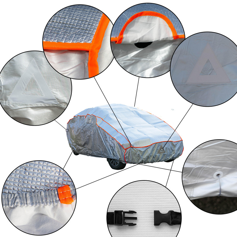 Materiál: reflexná vonkajšia vrstva v hornej časti autoplachty chráni pred UV žiarením a všetkými nepriaznivými a poveternostnými podmienkami. Druhá mäkká vrstva z pevného PVC s hrúbkou 5mm je schopná chrániť vozidlo pred poškodením spôsobeným krupobitím. Autoplachta je vybavená slučkami, ktoré umožňujú pripevnenie k vozidlu pomocou pribaleného lana a visacieho zámku. Ponúka tiež reflexné pruhy na zvýšenie viditeľnosti v noci. Autoplachta je dodávaná s taškou pre praktické uskladnenie.