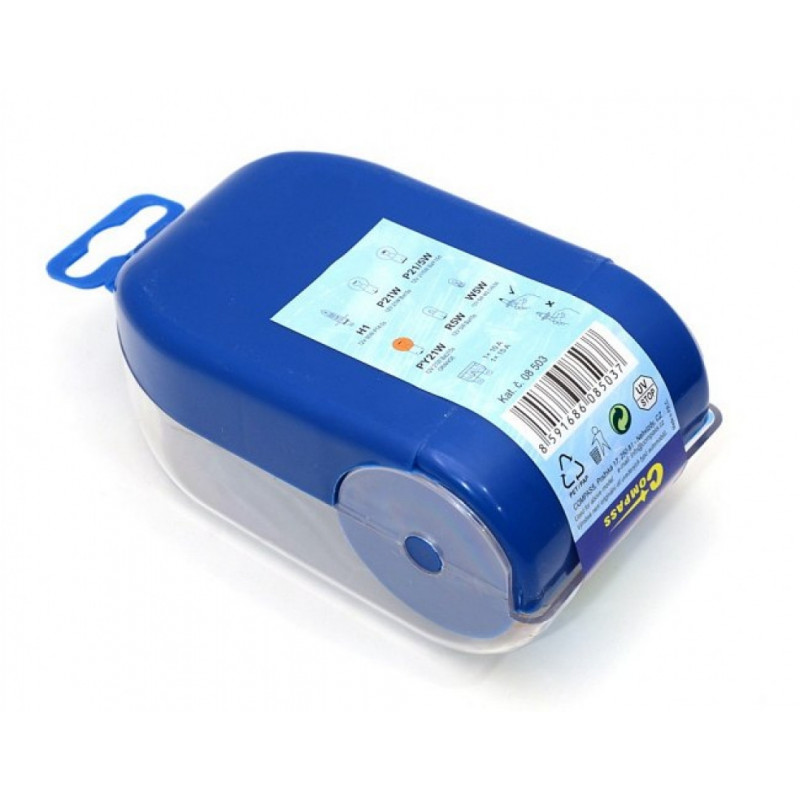 Plastová krabička náhradných autožiaroviek a poistiek, homologizácia E.