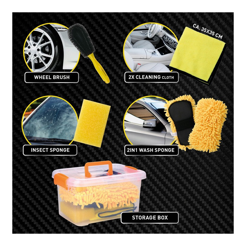 Všestranné využitie: Sada je navrhnutá tak, aby ste mohli čistiť rôzne povrchy vozidla, vrátane karosérie, okien a kolies. Je praktickým pomocníkom pre každého vodiča, ktorý chce svoje auto udržiavať v bezchybnom stave.