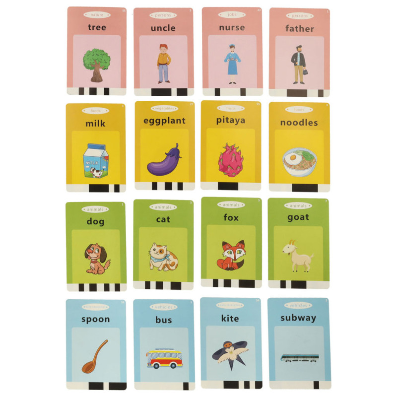 Každá z 112 dvojstranných kariet obsahuje 2 anglické slová s ilustráciou a výslovnosťou. Farebné rozlíšenie pomáha rozdeliť karty podľa tém: