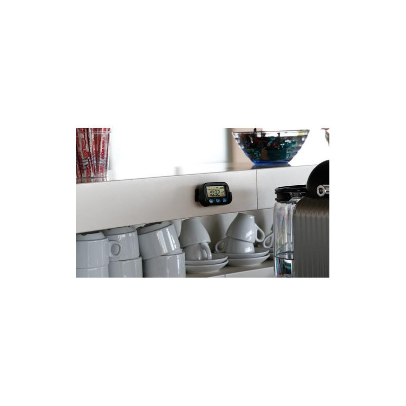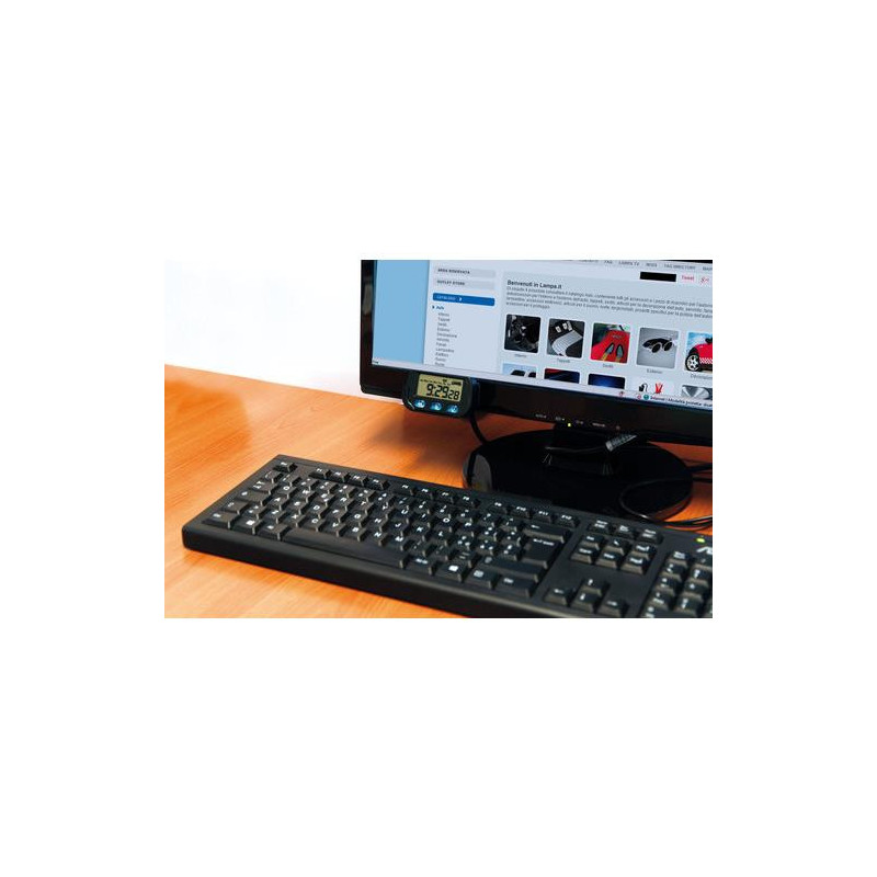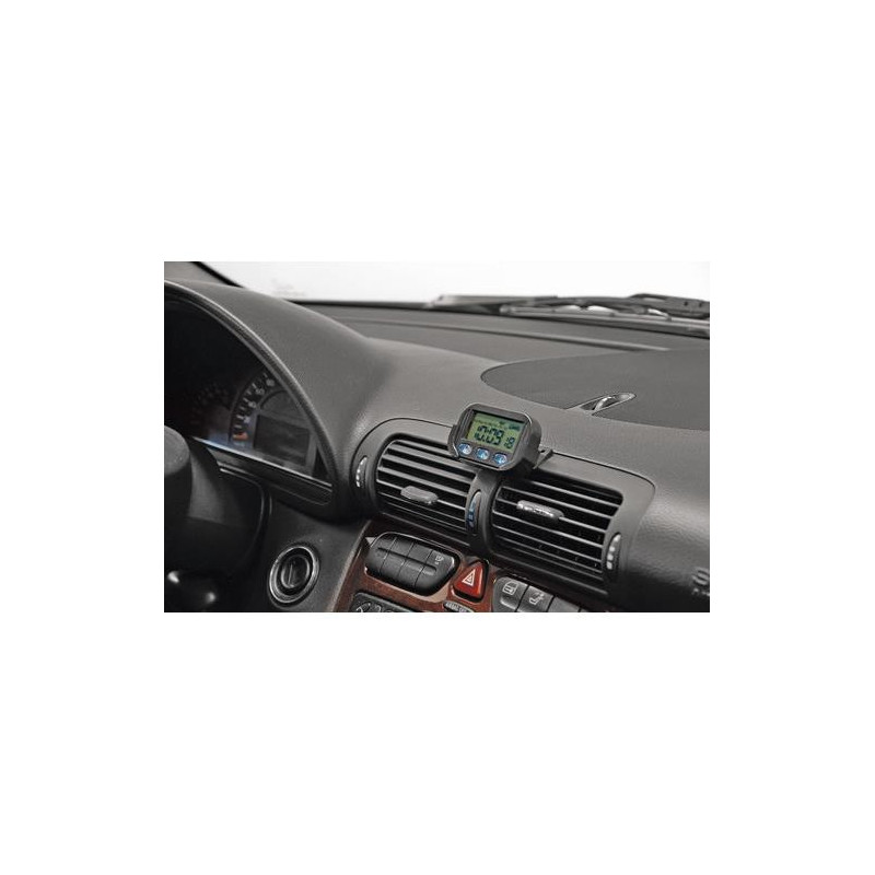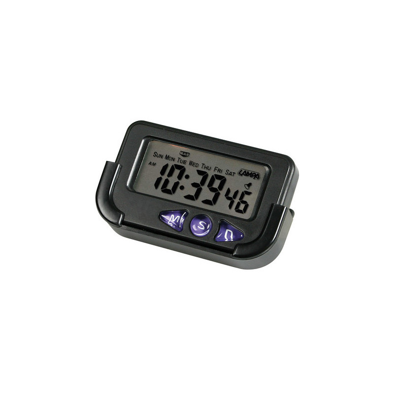 LCD kremenné digitálne hodiny. Hodiny, minúty, sekundy, dátum, mesiac, pracovné dni, alarm a chronometer. Displej s veľkými písmenami pre ľahké čítanie. Držiak s nastaviteľným uhlom a lepiacou podložkou. Batérie sú súčasťou balenia. Rozmer: 68 x 42 x 12 mm