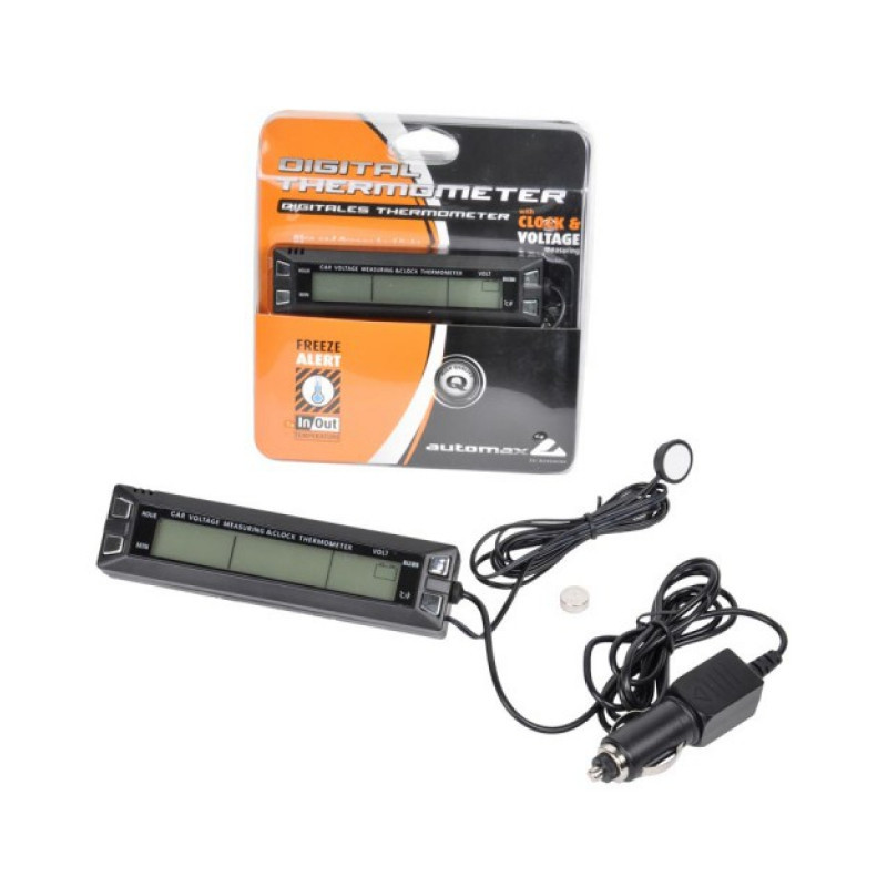 Digitálny teplomer s ukazovateľom minimálne a maximálnej hodnoty meranej teploty, hodiny a voltmeter s LED podsvietením. Kontroluje a zobrazuje napätie akumulátora v reálnom čase. Kontrolka a ikona napájania ako aj podsvietenie sa rozsvietia, po zapojení konektora zapaľovača do zásuvky zapaľovača vozidla. Možnosť upevnenia na palubnej doske automobilov, poľnohospodárskej i stavebnej techniky. Prístroj je možné pripevniť pomocou samolepiacej pásky, ktorá je súčasťou balenia.