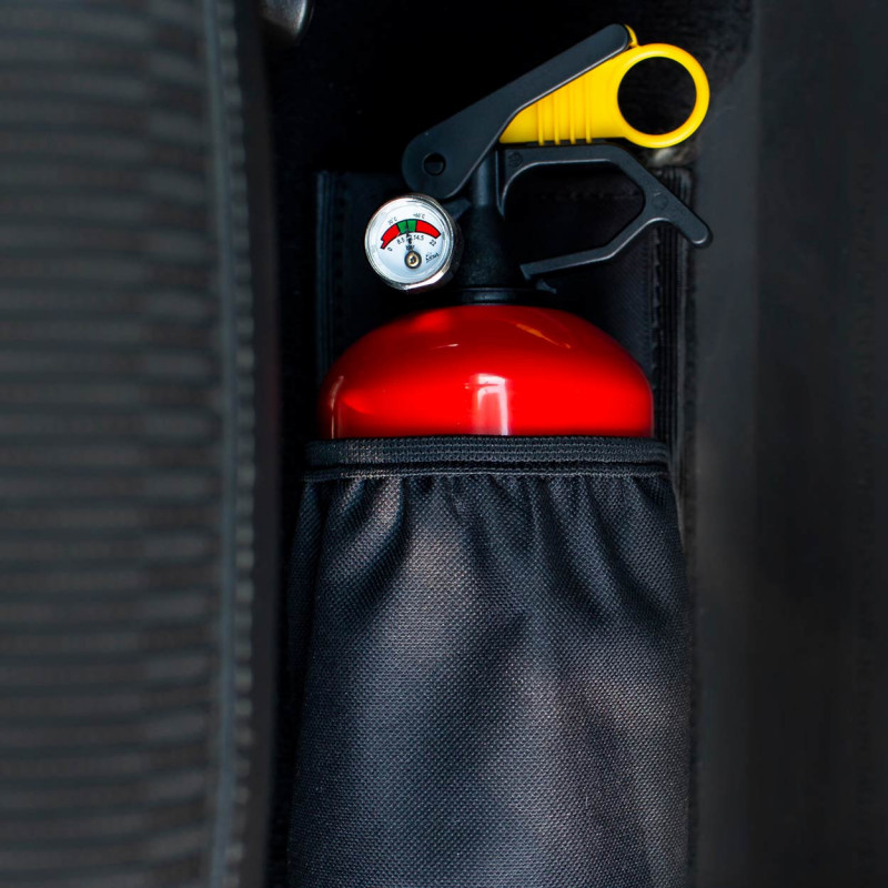 Vďaka nášmu držiaku môžete hasiaci prístroj bezpečne prepravovať v kufri vášho auta! Silný suchý zips drží hasiaci prístroj pevne a nepohybuje sa v kufri!
