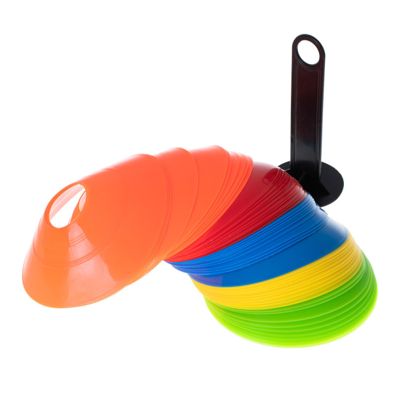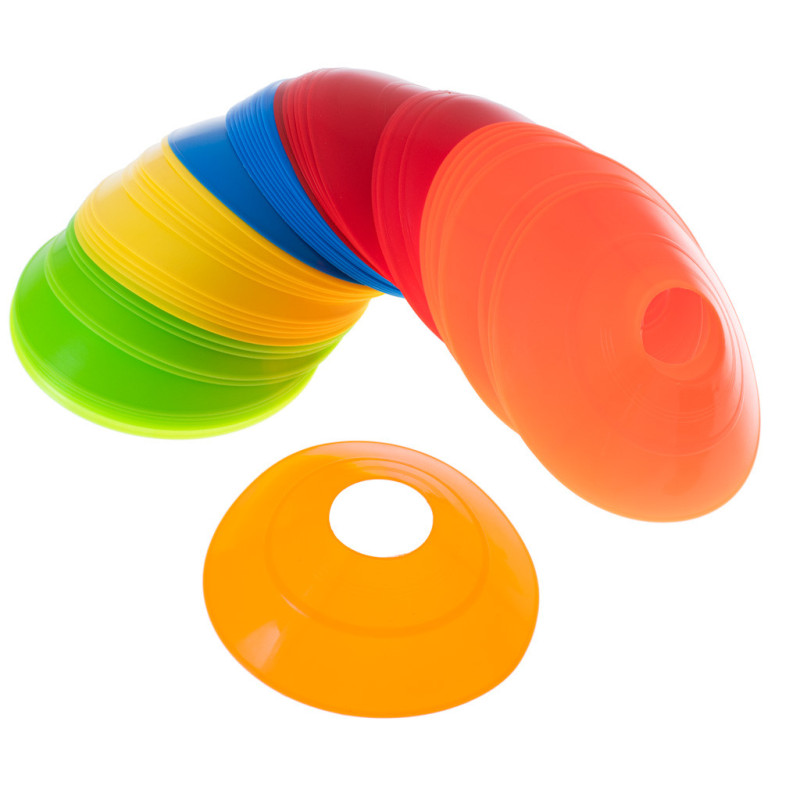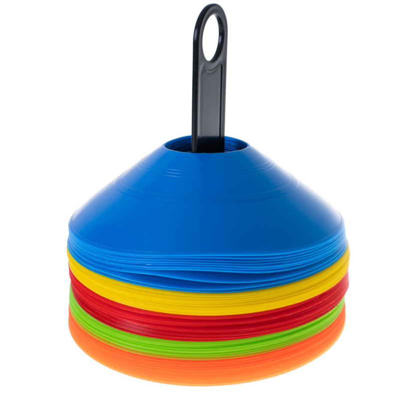 Praktická tréningová pomôcka, ktorú využijete pri športových aktivitách, hrách a pohybových cvičeniach. Set 50 ks kužeľov v 5 rôznych farbách je ideálny na tréningy futbalu, atletiky, slalomy alebo vyznačovanie ihriska a zón.