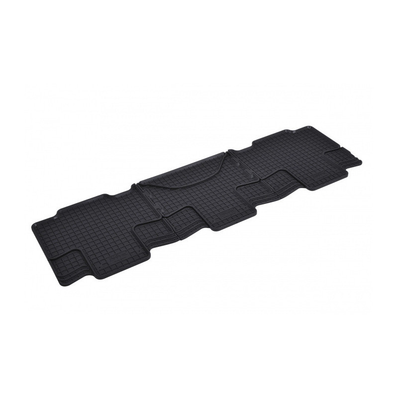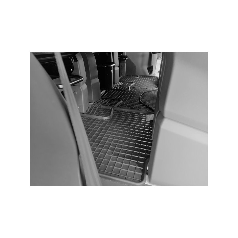 Gumené rohože na mieru pre VOLKSWAGEN T7 Multivan 3.rada (2022->). Rohože sú vyrobené presne na mieru interiéru daného vozidla. Lacnejšia náhrada originálnych rohoží.