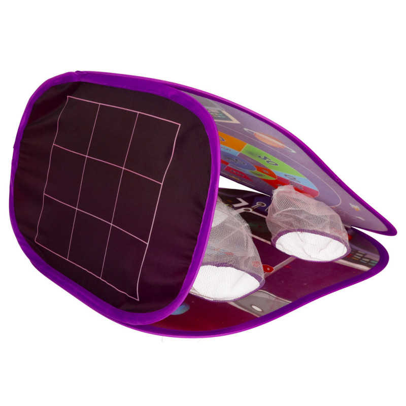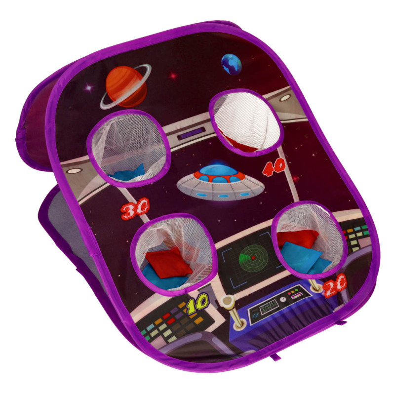 Na jednej strane stojaceho terča sa nachádza cieľ s bodovaním určený pre loptičky na suchý zips, na druhej strane sú 4 otvory, do ktorých sa hádžu farebné vrecúška. Vďaka plastovým kolíkom je možné hru bezpečne ukotviť aj vonku na záhrade alebo v parku.