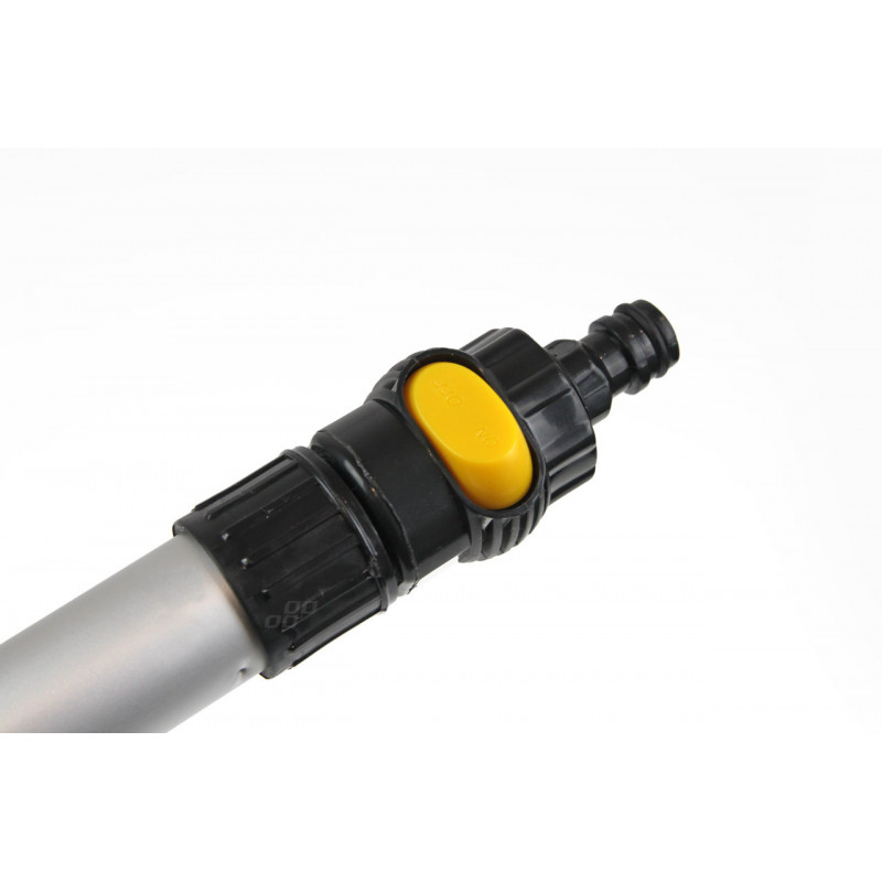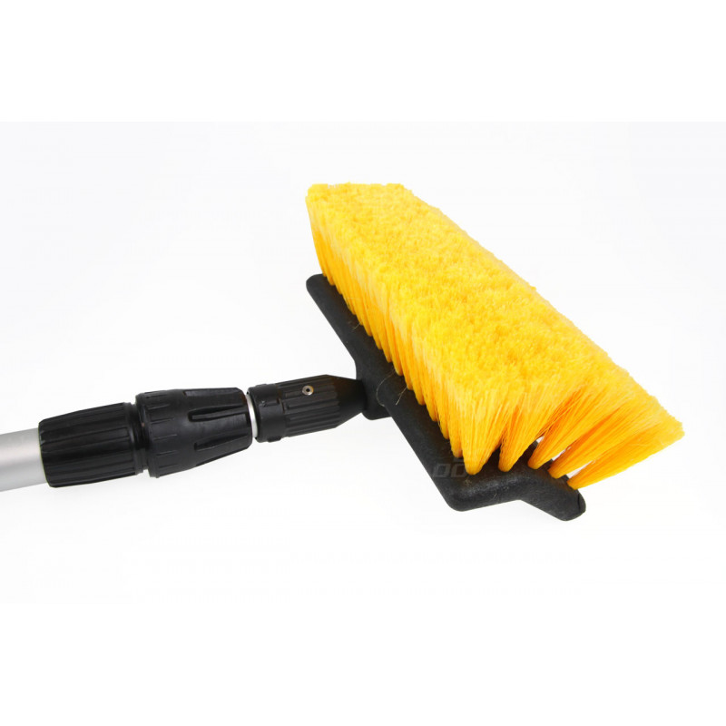 Popis produktu Robustná teleskopická kefa s hliníkovou tyčou s nastaviteľnou dĺžkou od 145 do 250 cm. Kefa je vyrobená z mäkkých vlákien, ktoré nepoškodzujú povrch laku. Tyč má rukoväte z peny, rýchlospojku na pripojenie vodnej hadice a ventil na prietok vody.