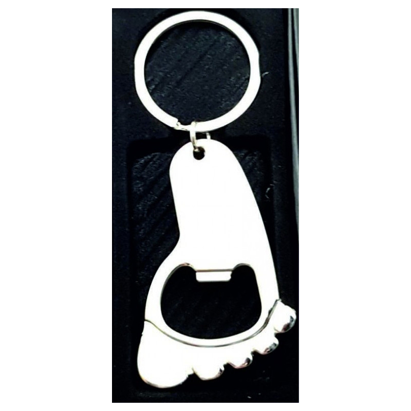 Prívesok v tvare nohy, ktorá slúži ako otvarák, je vyrobený z nerezovej ocele a je vhodný aj ako kľúčenka.