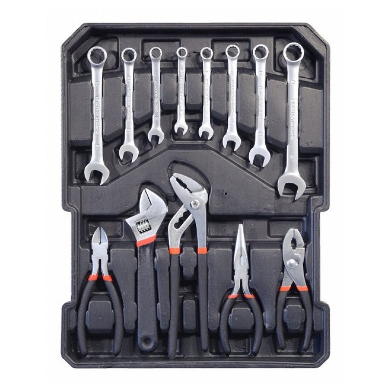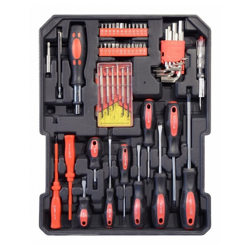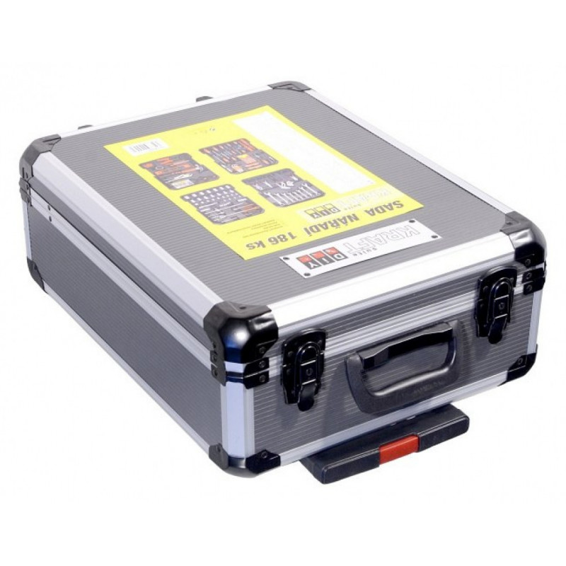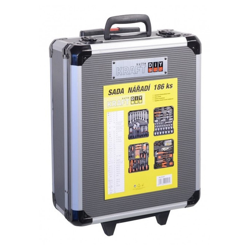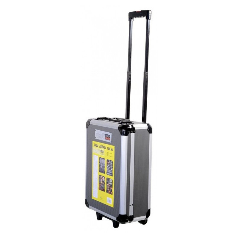Praktický hliníkový kufor, 186 dielov kvalitného náradia, všetko usporiadané v prehľadných pozíciách - 4 nástrojová plata. Kufrík je vybavený teleskopickým úchytom a kolieskami, vďaka ktorým je manipulácia s celou sadou náradia veľmi jednoduchá. Sada obsahuje celý rad klieští, skrutkovačov, gola kľúčov, kladivo, vodováhu, stranové aj imbus kľúče, bity, základný spojovací materiál a celý rad ďalšieho náradia, ktoré je vhodné pre použitie ako doma, v garáži, tak aj na cestách. Rozmery kufra: 36 x 51 x 20 cm.