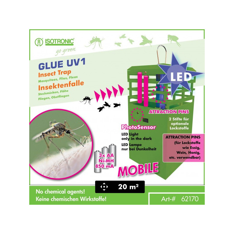 Tento lapač hmyzu pracuje bez chemikálií a nespôsobuje žiadne znečistenie životného prostredia. Nepríjemný hmyz, najmä komáre, ovocné mušky a komáre, priťahuje špeciálne modré a osvedčené svetlo. Na ceste k zdroju svetla sa tieto lepia na lepiacu fóliu integrovanú v prístroji.