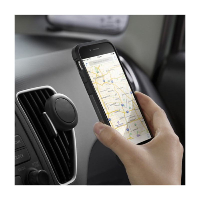 Vďaka jeho minimalistickému dizajnu a kompaktným rozmerom je praktickým doplnkom do auta. Jeho montáž je navyše veľmi jednoduchá nakoľko ho stačí iba zasunúť do mriežky ventilátora. K držiaku sú dodávané 2 kovové platničky ktoré sa buď prilepia na zariadenie alebo vložia pod kryt. Tie slúžia na uchytenie zariadenia k držiaku. Styčná plocha držiaku je vybavená protišmykovou gumou, ktorá udrží zariadenie spoľahlivo na svojom mieste. V prípade, že sa držiak nevyužíva je kvôli kompaktným rozmerom a neutrálnej farbe v interiéri vozidla takmer neviditeľný.