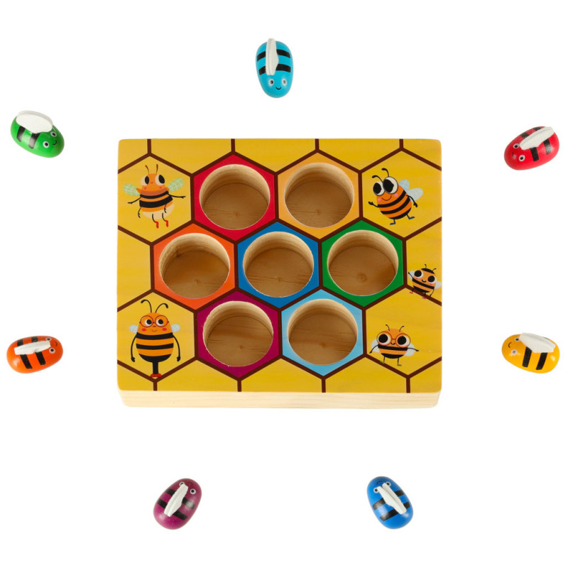 Úlohou dieťaťa je vybrať farebné včely pomocou priloženej pinzety a potom umiestniť každú včelu do otvoru zodpovedajúceho jej farbe.