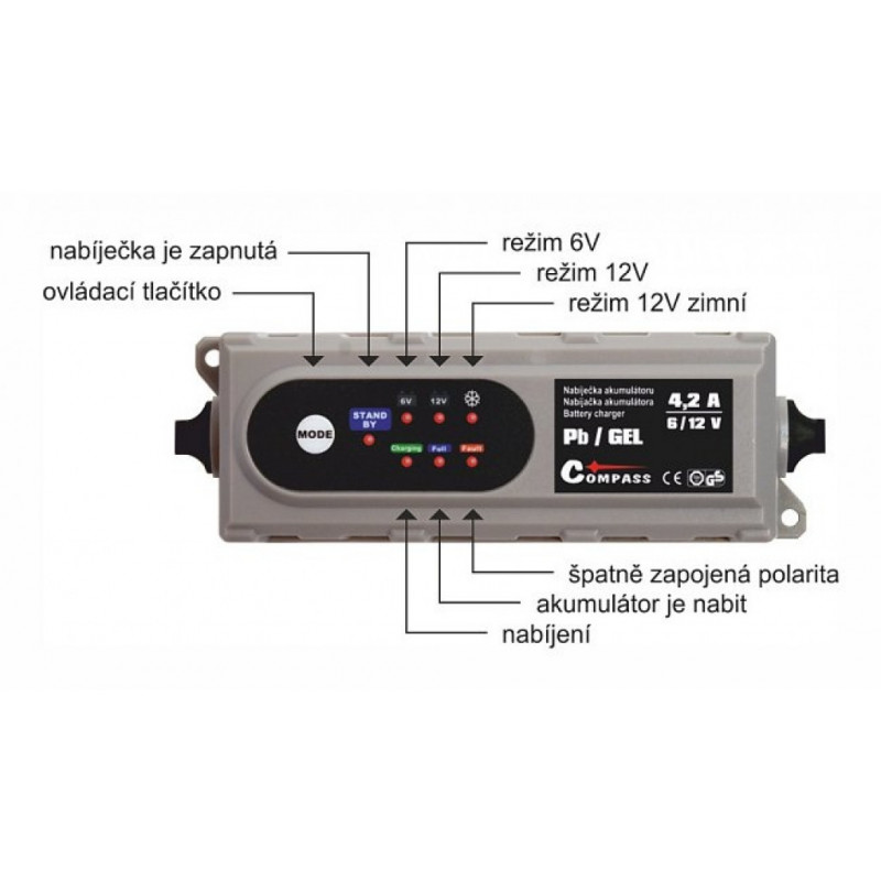 Stabilné nabíjací prúd 4,2 A, vysoká účinnosť (85%). Kompaktná veľkosť umožňuje ideálne využitie doma, na ceste aj v garáži. Nabíja všetky typy 6 / 12V olovených (Pb) akumulátorov - bezúdržbové GEL (gélové), AGM, MF, VRLA, údržbové PbWet a PbCa. Pulzný dobíjanie predlžuje životnosť batérie a udržuje ju v lepšej kondici.