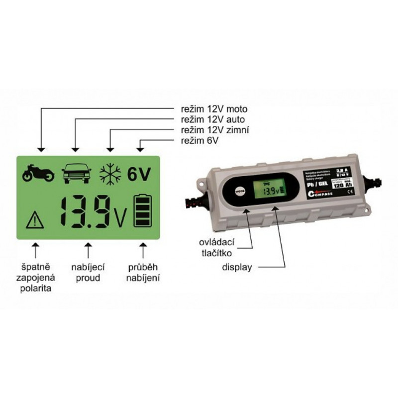 Nabíjačka automaticky rozpozná, ak je pripojený 6V alebo 12V akumulátor. Pri zapojení 12V akumulátoru možno zvoliť režim nabíjania štandardné alebo zimné.