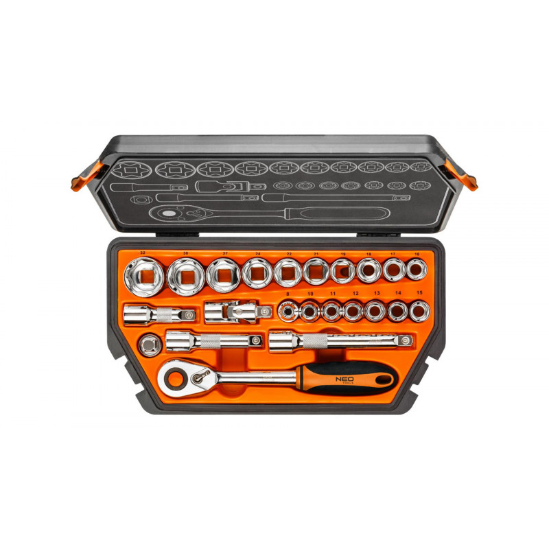 NEO Sada kľúčov 1/2 ' - 23 kusov vyrobených z vysoko kvalitnej chróm-vanádiovej ocele. Sada obsahuje račňu s odolným račňovým mechanizmom (48 zubov), širokú škálu nástavcov (veľkosť od 8 do 32 mm), predĺženie, spoj a adaptér 1/2'M x 3/8'F. Dodávané v praktickom púzdre. Kvalita náradia je potvrdená certifikátom TÜV a 25-ročnou zárukou od výrobcu. Značka NEO spĺňa očakávania profesionálov.