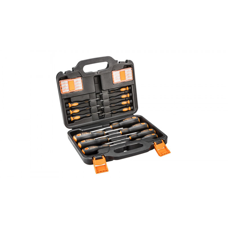 NEO Sada skrutkovačov a skrutkovacích nástavcov obsahuje 30 kusov najvyššej kvality. Hrot skrutkovačov je vyrobený z mimoriadne odolnej ocele S2, ktorá zaručuje dlhú životnosť. Skrutkovače majú magnetický hrot. Tvar trojramennej rukoväte s profilovanou opierkou na palec znižuje námahu pri práci a uľahčuje dosiahnutie správneho krútiaceho momentu. Protišmyková rukoväť vyrobená z dvoch materiálov je odolná voči chemikáliám, olejom a tukom. Kvalita nástroja je potvrdená zárukou výrobcu na 25 rokov. Balené v praktickom kufríku, čo uľahčuje prepravu a skladovanie. Značka NEO spĺňa očakávania profesionálov.