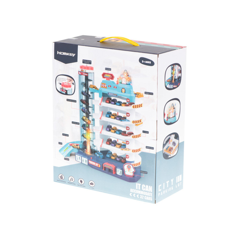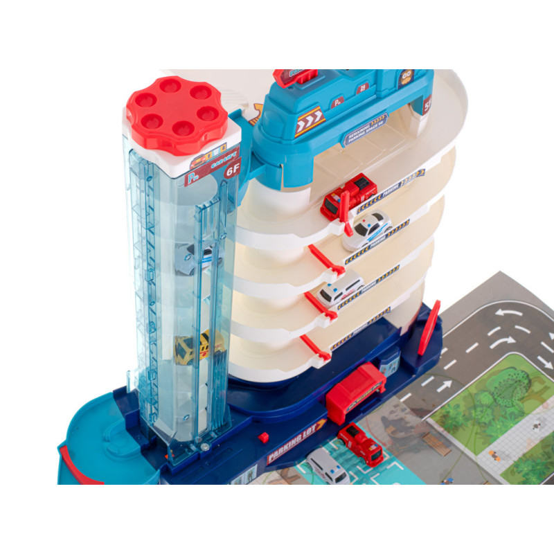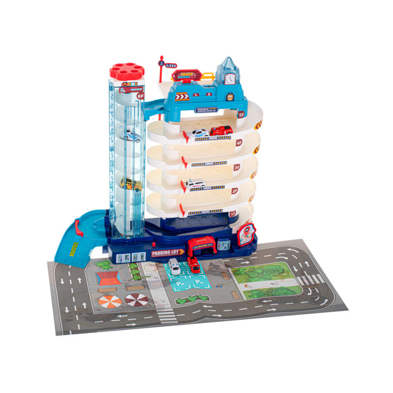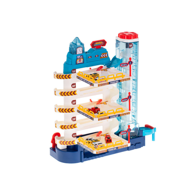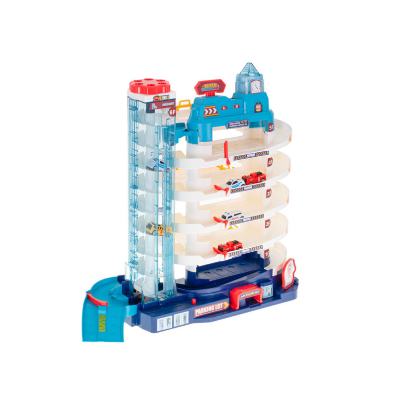 Garáž má až 5 poschodí, ktoré sú určené na parkovanie áut zo sady. Na úplný vrchol sa autíčka dostanú pomocou automatického výťahu s osvetlením. Počas jazdy hore blikajú farebné svetlá, ktoré spríjemnia každú jazdu.