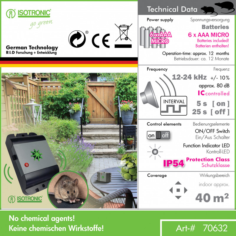 Nebudete sa musieť rozčuľovať nad nežiaducimi návštevami hlodavcov vo vašich priestoroch. ISOTRONIC Vario-Protector Mobile udržuje týchto zlých návštevníkov mimo vášho domu, záhrady, garáže, stodoly, podkrovia alebo altánu. Okamžite pripravené na použitie, nie je potrebné žiadne napájanie ani žiadna montáž. Integrované 30-sekundové intervalové prepínanie zabráni zvieratám v zvyknutí si na zvuk.