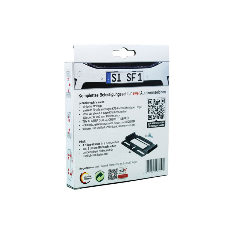 Nová univerzálna upevňovacia súprava Simple-Fix ponúka optimálnu možnosť jednoduchého upevnenia ŠPZ vpredu aj vzadu bez zbytočného vŕtania, no pritom je jednoduchá a bezrámová - takmer neviditeľná v priehľadnom prevedení, testované TÜV!