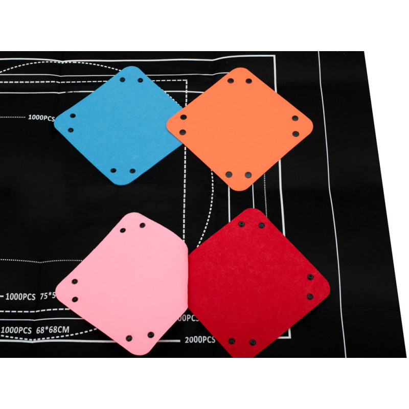 Podložka je celá vyrobená z polyesteru s textúrou pripomínajúcou plsť. Má biely okraj, ktorý ukazuje, akú plochu bude zaberať usporiadaný vzor.