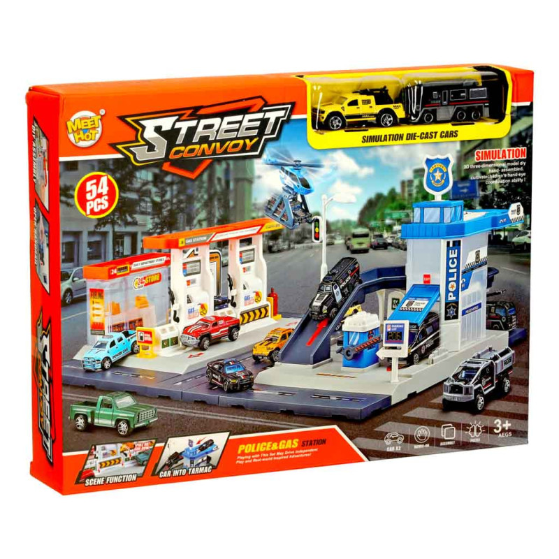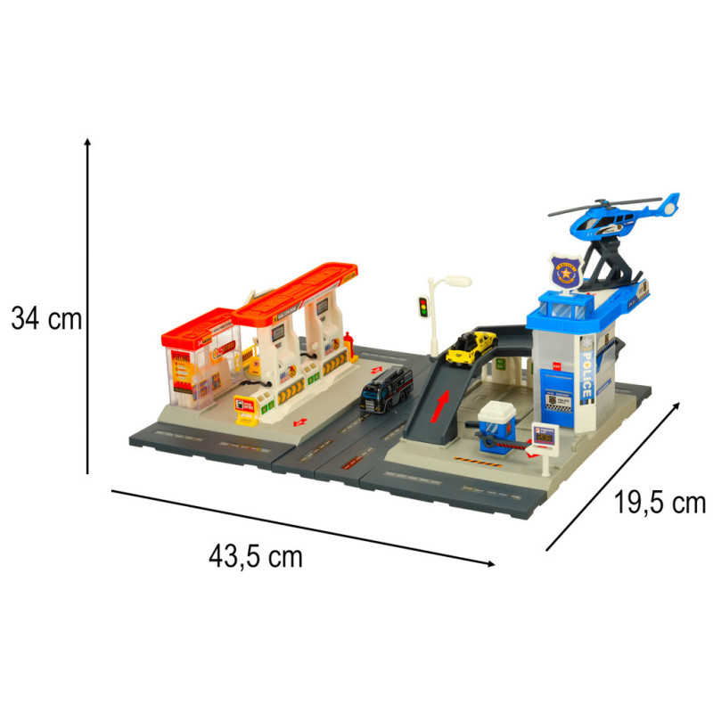 Herný set policajná stanica a čerpacia stanica prenesie deti do sveta tvorivej hry plnej akcie a zábavy. Súprava obsahuje 2 autíčka a vrtuľník, vďaka čomu môžu deti vytvárať rôzne herné scenáre a rozvíjať svoju fantáziu. Hra podporuje kreativitu, predstavivosť a jemnú motoriku. Dráha sa skvele hodí ako súčasť akejkoľvek hračkovej „mestečka“ a rozširuje možnosti hrania.