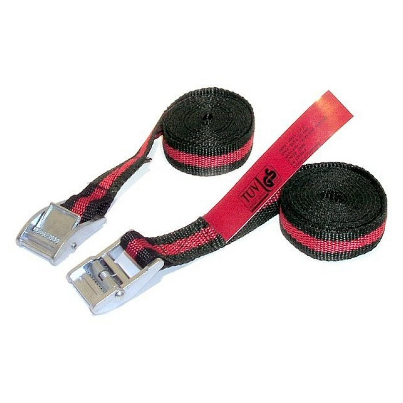Upínacie popruhy vysokej kvality, s kovovou sponou, homologizácia TÜV / GS. Dĺžka 2,5 m, šírka 25mm, sada 2 kusy.