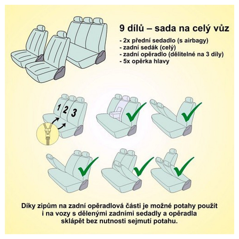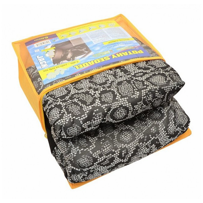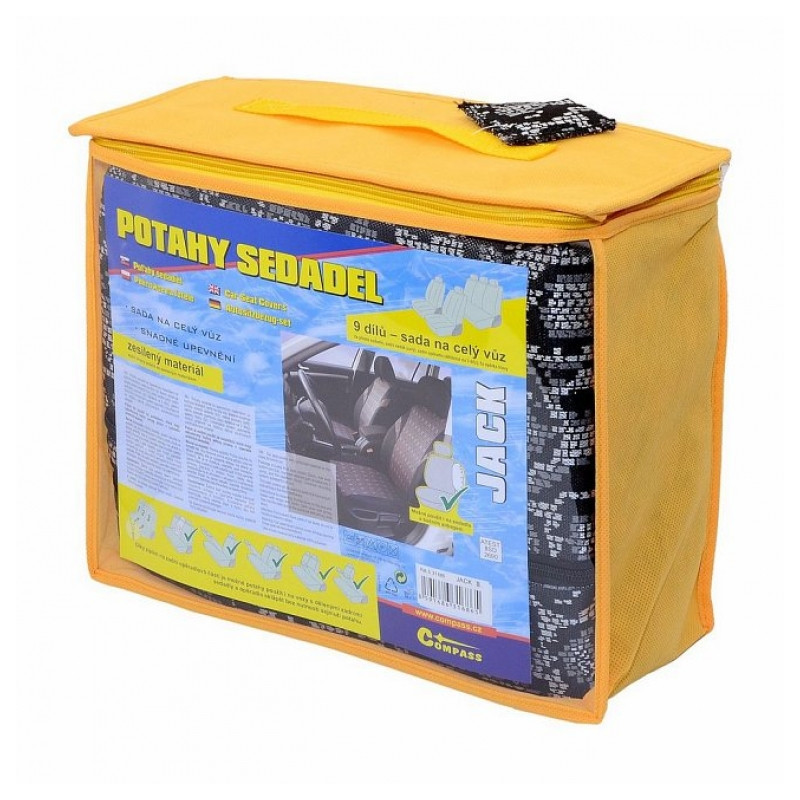 Poťahy sedadiel JACK, sada na celý automobil. Poťah je vyrobený zo spevneného podšitého materiálu v celej ploche, možno pripevniť na väčšinu bežne používaných automobilových sedadiel. Poťah možno použiť na sedadlách, ktoré majú zabudovaný bočný airbag priamo v operadle predných sedadiel. Balenie obsahuje poťah na predné sedadlo (2x), zadný sedák (celý), zadné operadlo (pomocou zipsu deliteľné na 3 diely), opierku hlavy (5x). Vďaka zipsom na zadnej operadlovej časti je možné poťahy použiť aj na vozidlá s delenými zadnými sedadlami a operadla sklápať bez nutnosti sňatí poťahu.