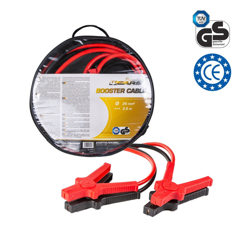 PREMIUM Štartovací kábel - farebne označené izolované svorky pre ľahšiu manipuláciu, balené v praktickom obale. Dĺžka kábla je 3,5m.