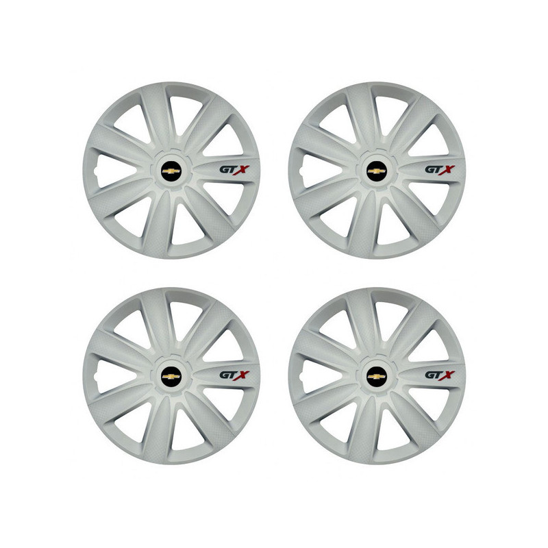 Puklice 14 GTX carbon white pre Chevrolet na ocelové disky. Pre kolesá o veľkosti R14 so živicovými samolepkami Chevrolet.Címzett :