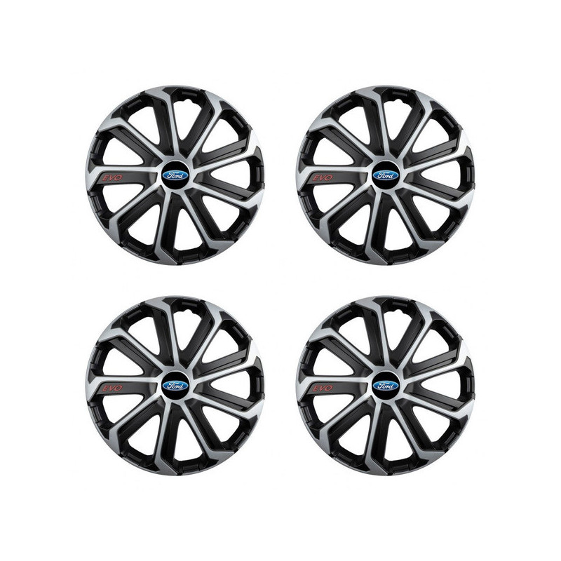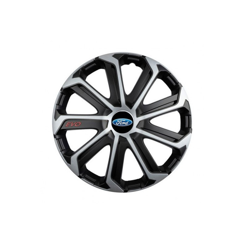 Puklice 15 Evo black&silver pre Ford na ocelové disky. Pre kolesá o veľkosti R15 so živicovými samolepkami Ford.Címzett :