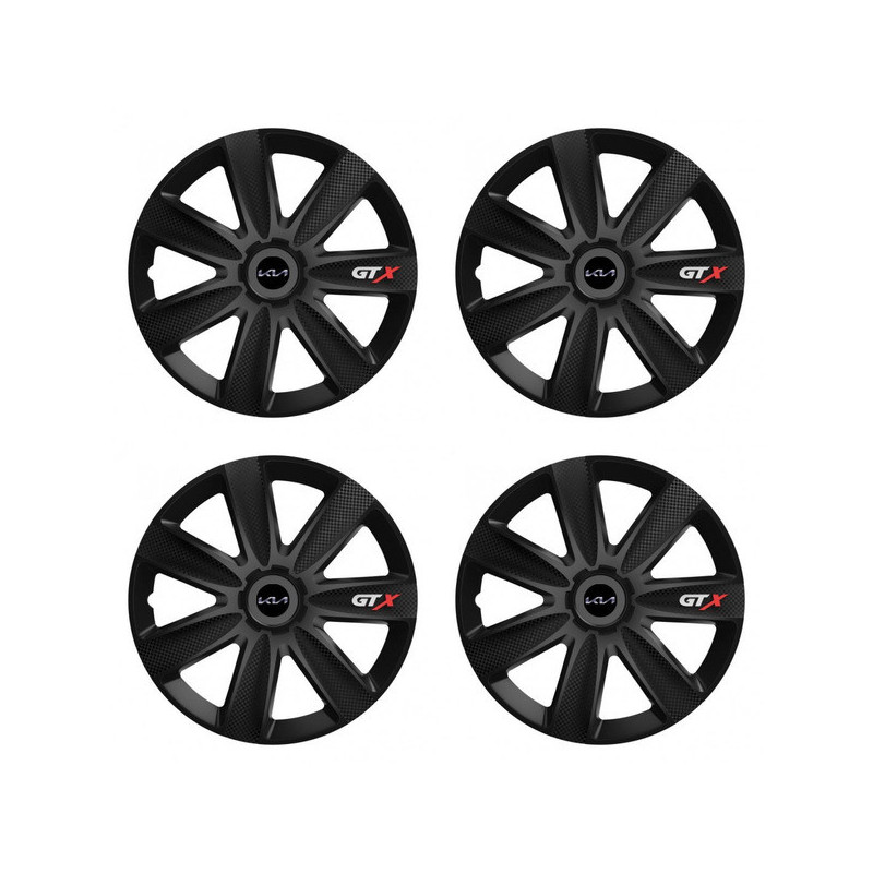 Puklice 14 GTX CARBON black pre Kia (nové logo) na ocelové disky. Pre kolesá o veľkosti R14 so živicovými samolepkami Kia (nové logo).Címzett :