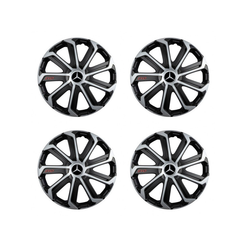 Puklice 16 Evo black&silver pre Mercedes na ocelové disky. Pre kolesá o veľkosti R16 so živicovými samolepkami Mercedes.Címzett :
