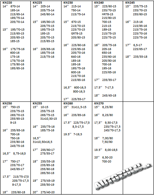 2. Nájdite rozmer pneumatík a zvoľte rozmer reťazí (napr. ak máte 225/60R16 teda 225 je šírka pneumatiky, 60 je bočný profil, 16" je priemer pneumatiky: Zvolíte reťaze KN230)