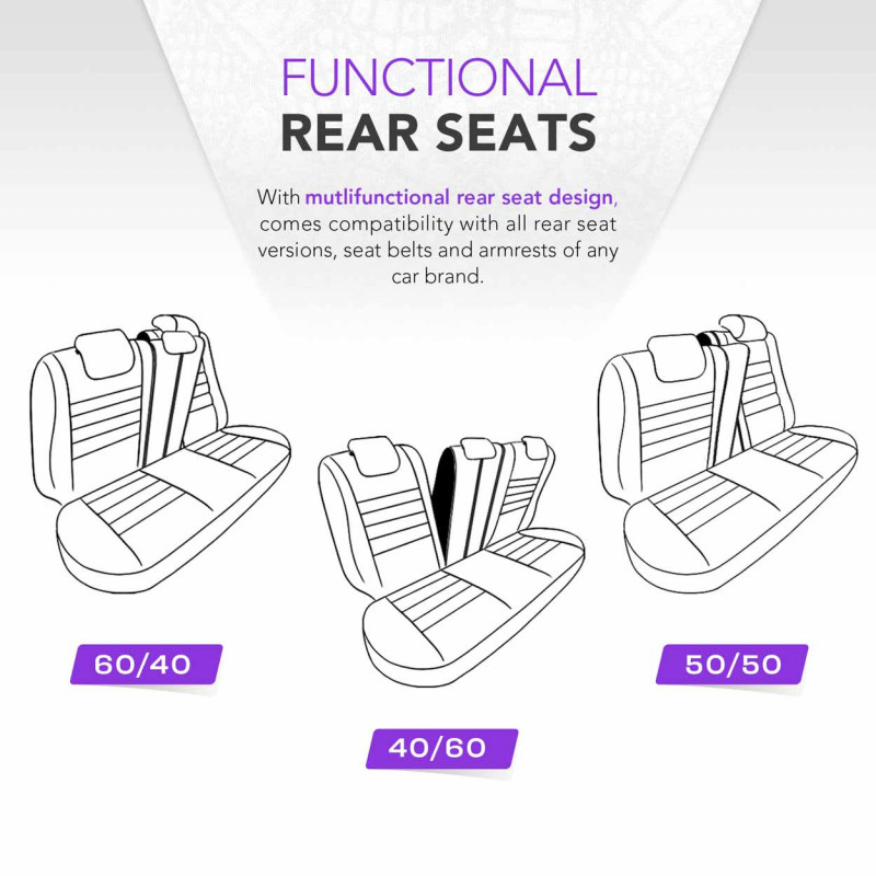 Poťahy majú zapínanie na zadnom sedadle, vďaka čomu pasujú na väčšinu sedadiel dostupných na trhu (nedelené pohovky).