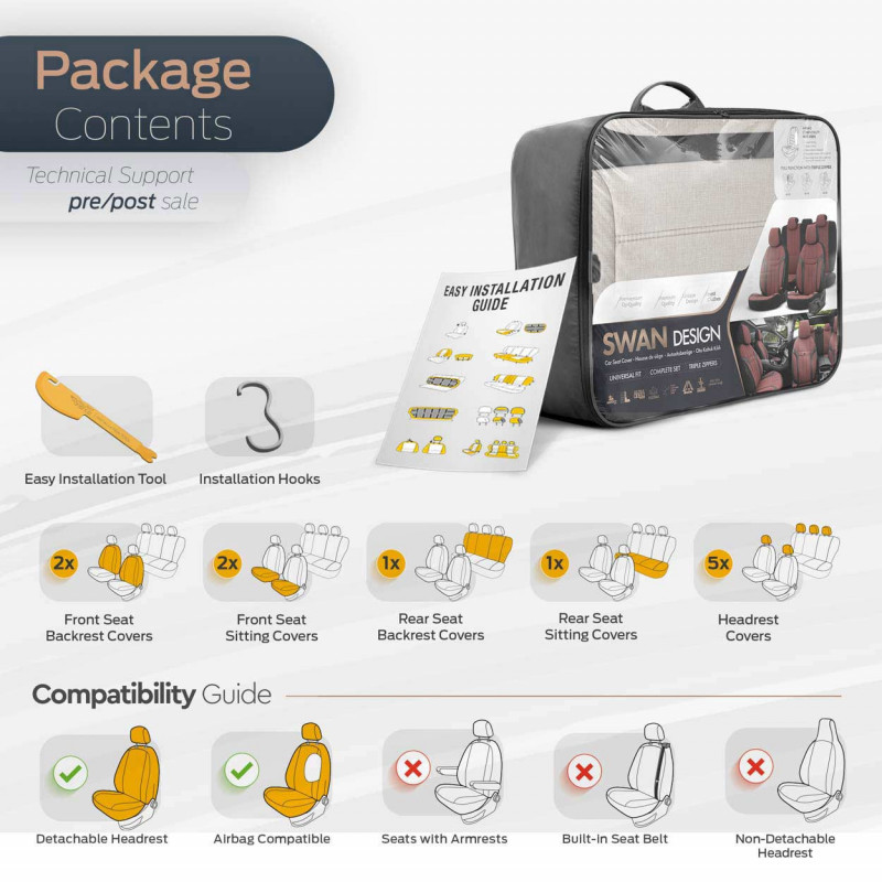 Poťahy majú zapínanie na zadnom sedadle, vďaka čomu pasujú na väčšinu sedadiel dostupných na trhu (nedelené pohovky).