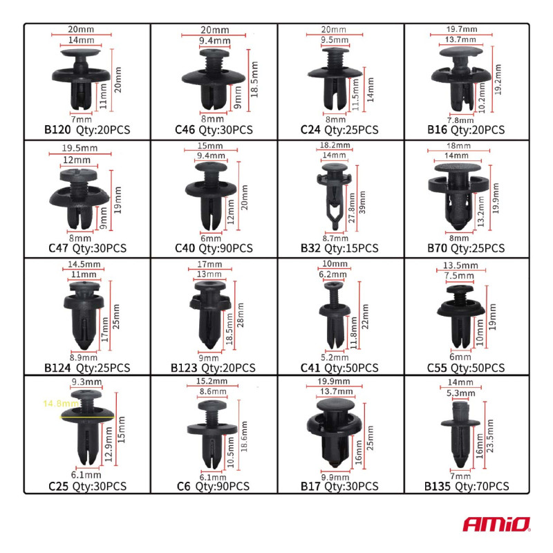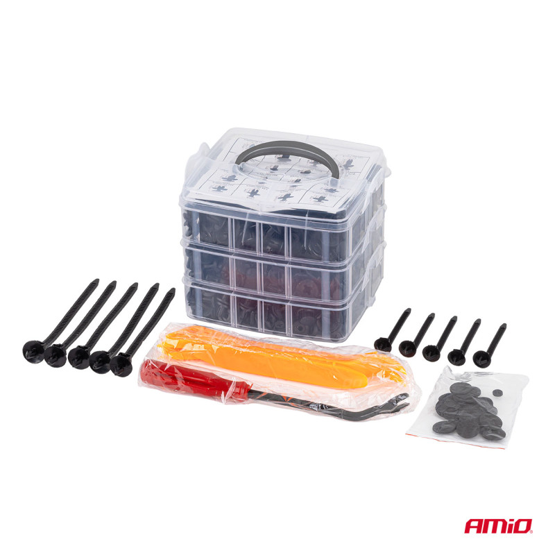 Sada univerzálnych upevňovacích prvkov, klipov, hmoždiniek spolu s nástrojmi na ich demontáž – celkom 650 kusov. Vyrobené z vysoko kvalitného PVC plastu, ktorý zaručuje odolnosť a dlhú životnosť.
