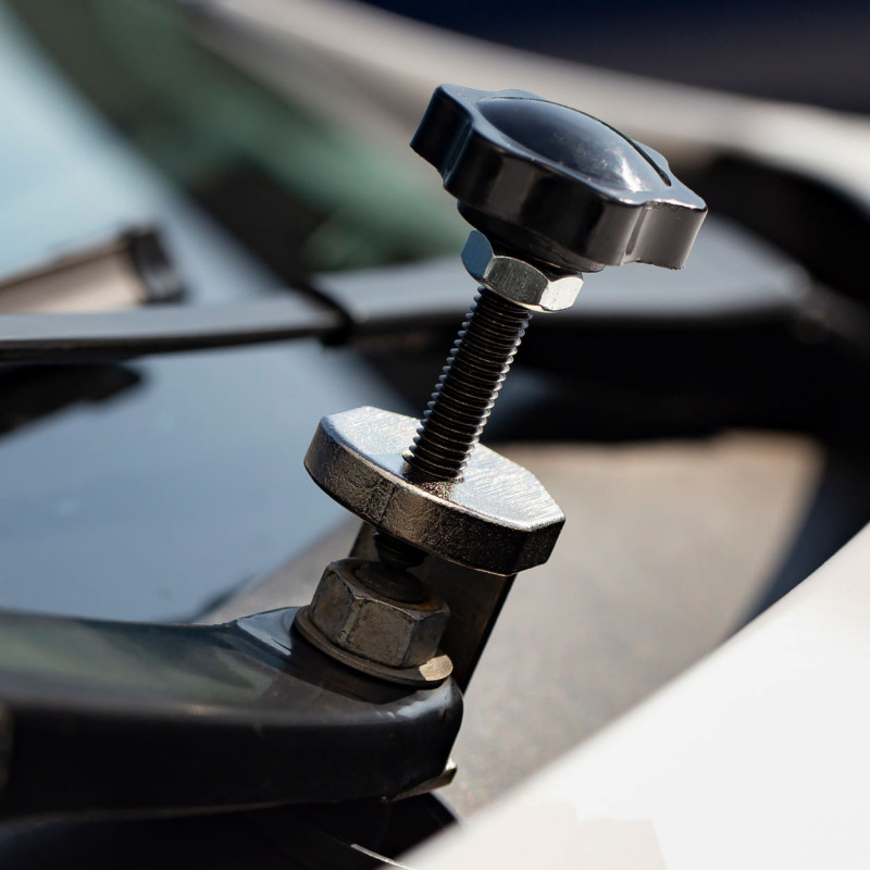 Princíp činnosti: tvarované čeľuste zachytávajú ramienko stierača, pomocou skrutky sa ramienko vysúva z objímky.