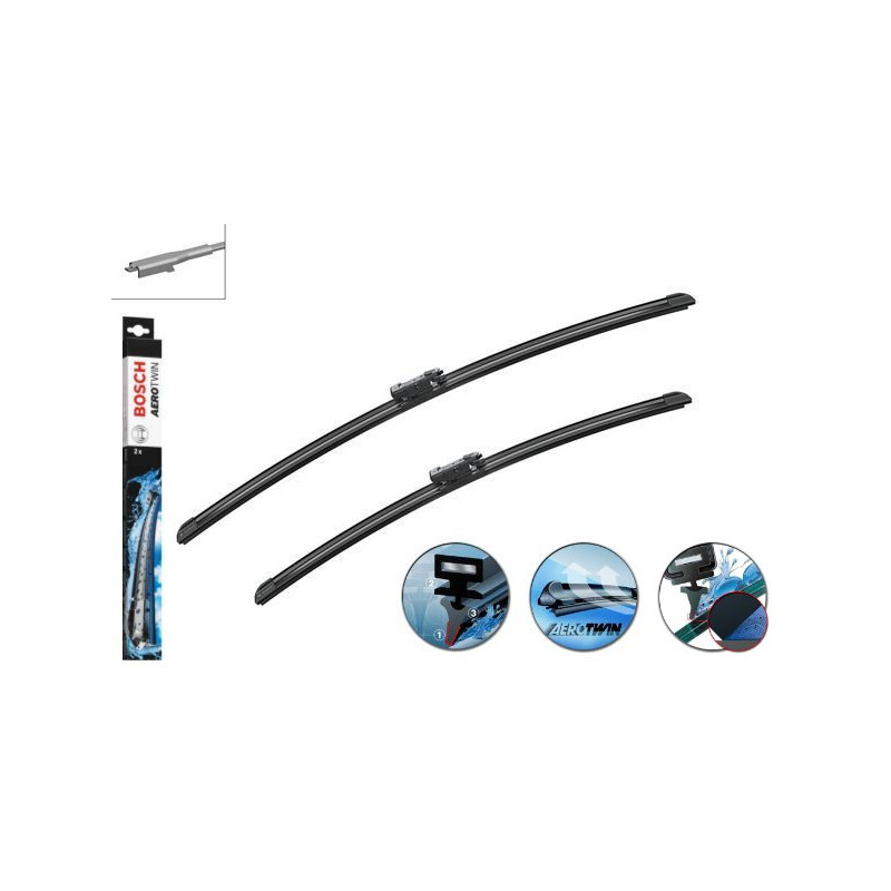<p> Model stieračov špeciálne určený pre toto vozidlo. Stierače AeroTwin s plochou lištou sú bezramienkove stierače s aerodynamickým tvarom. Vďaka rovnomernej sile prítlaku v celej dĺžke stieracej lišty sa znižuje opotrebenie a zvyšuje sa doba životnosti.</p> <p> <strong>Stierač je bez ostrekovača. Prosím skontolujte si či máte stierače bez ostrekovača !! </strong></p> <p> <br /> Sada:<br /> - sada obsahuje 2ks stieračov o dĺžke 650/550mm<br /> - uchytenie špeciálne pre tento model auta<br /> - cena je uvedená za celú sadu<br /> <br /> Technológia:<br /> - P.P.P. (Power Protection PLus) - tvar gumičky znižuje hlučnočnosť, extrémne tichá, bez šumu a trenia<br /> - Evodium high-tech - prúžná aerodynamická lišta stierača<br /> <br /> Kritériá kvality stieračov AeroTwin od spoločnosti Bosch:<br /> - rovnomerné rozloženie stierania až 700 000 stieracích cyklov<br /> - dokonalé stieranie aj pri vysokých rýchlostiach (> 160 km / h) vďaka aerodynamickej lište<br /> - vyvíjané v aerodynamickom tuneli<br /> - tichý chod, jasný výhľad, žiadne rozmazávanie alebo škrípanie po skle<br /> <br /> Bosch výrobca:<br /> - víťaz rady prestížnych ocenení a porovnávacích testov