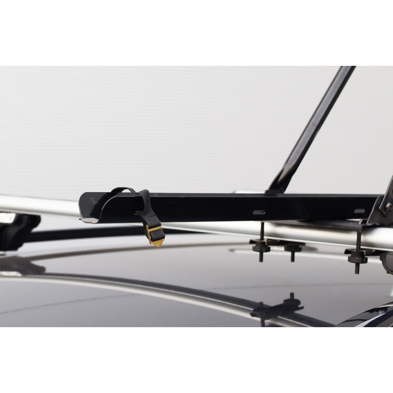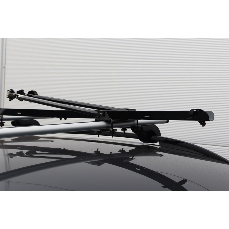 Praktický a ľahký oceľový držiak bicyklov je určený pre montáž na strešný nosič (tyče) auta. Kompletný držiak bicyklov s bezpečnostným zámkom a podložkami pre kolesá bicykla.
