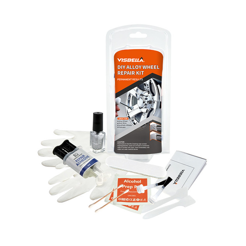 Sada na opravu zliatinových kolies Visbella® je určená na trvalé opravy diskov po poškodení od obrubníkov, škrabancov, malých preliačin, poškodení pri inštalácii, brúsnych škvŕn a iných poškodení zliatinových kolies, syntetických kolies, oceľových ráfikov a krytov kolies a mnohých ďalších na podobnom povrchu. Sada obsahuje všetko, čo potrebujete na opravu škrabancov v krátkom čase. OBSAH súpravy : 1 x 6ml opravné lepidlo 1 x 5 ml striebornej farby 2 x rukavice 2 x Čistiace prostriedky 1 x Brúsny pilník 2 x špachtľa 2 x vatový tampón 2 x kefa 1 x Návod na použitie VÝHODY A VLASTNOSTI: Trvalá a jednoduchá oprava. Tepelne odolný do 150°C . Odolný voči vibráciám, odolný pri umývaní auta. POSTUP PRI OPRAVE : Krok 1 Odstráňte všetky drsné hrany alebo nerovnosti okolo poškodeného miesta pomocou brúsneho pilníka. Krok 2 Vyčistite poškodené miesto čističom Krok 3. Identifikujte veľkosť škody v cieľovej oblasti. Skontrolujte poškodené miesto a rozhodnite sa, či je potrebné použiť lepidlo. Ak je poškodenie vážne, pokračujte krokom 4. Ak je poškodenie mierne, prejdite na krok 5. Krok 4. Zmiešajte lepidlo priloženou špachtľou. Keď je zmes zmiešaná do pevnej farby, pomocou špachtle vyplňte poškodenú oblasť zmesou a uistite sa, že povrch je hladký. Poznámka: Doba prevádzky je 2-3 minúty. Namiešaná lepiaca hmota vytvrdne za 5 minút. Krok 5. Maľovanie: Vyčistite poškodené miesto. Pomocou dodaného štetca a farby natrite poškodené miesto. (Pred použitím sa odporúča farbu pretrepať.) Nechajte farbu zaschnúť 1 hodinu. SKLADOVANIE: Produkty by sa mali ideálne skladovať na chladnom a suchom mieste v uzavretých nádobách pri teplote 8 až 28 °C, pokiaľ nie je uvedené inak. Optimálne skladovanie je v dolnej polovici tohto teplotného rozsahu. Aby ste zabránili kontaminácii nepoužitých produktov, nevracajte žiadny materiál do pôvodného obalu. Pozor: Horľavý & Škodlivý. Čistiace tampóny obsahujú Izopropylalkohol. V prípade kontaktu s očami ich ihneď vypláchnite vodou a vyhľadajte lekársku pomoc. UCHOVÁVAJTE MIMO DOSAHU DETÍ .