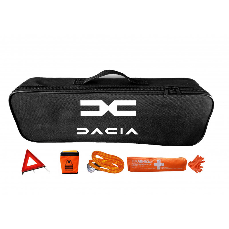 Obsah tašky: autolekárnička, výstražný trojuholník, ťažné lano 3t s karabínou, reflexná vesta v kapsičke, pár dielenských rukavíc
