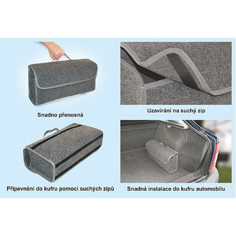 Univerzálna textilná brašna, určená predovšetkým do batožinového priestoru osobného automobilu. Uzatvárateľná na suchý zips, ľahko prenosná vďaka uchu na hornej strane. Pásy suchého zipsu na spodnej aj zadnej strane pre jednoduché prichytenie do batožinového priestoru automobilu.