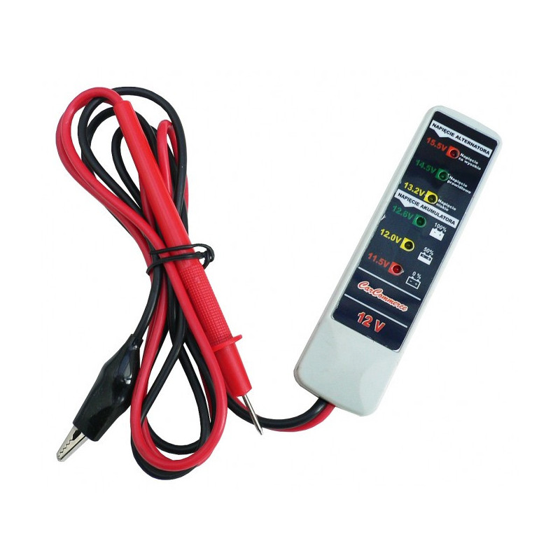 Tester akumulátora a alternátora 12V E61516 Zariadenie slúži na meranie napätia alternátora a aktuálneho napätia akumulátora. Alternátor: meranie je optimálne pri min. 2000 otáč. po dobu 2 min. Červená dióda—príliš vysoké napätie (nutné navštíviť servis) Žltá dióda - príliž nizke napätie ( nutné navštíviť servis) Zelená prípadne žlto zelená - optimálne napätie Akumulátor: Testuje sa za vypnutého motora. Červená dióda - príliš nízke napätie nutné dobiť akumulátor Červená +žltá dióda - nizke napätie nutné dobiť akumulátor Červená +žltá + zelená - optimálne napätie akumulátor je plne funkčný Káblové svorky : červený +pol čierny –pol
