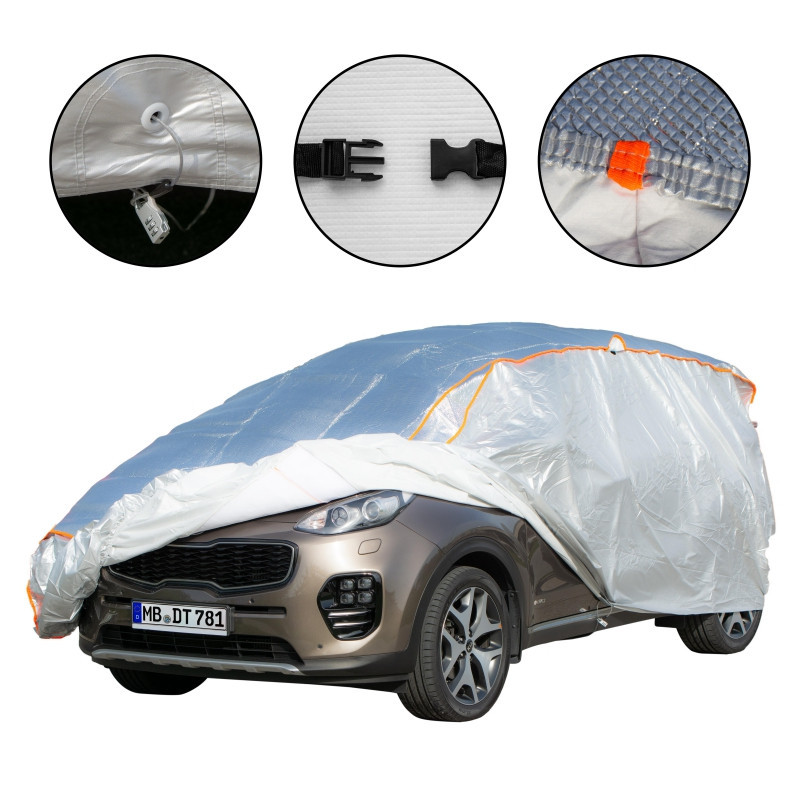 Materiál: reflexná vonkajšia vrstva v hornej časti autoplachty chráni pred UV žiarením a všetkými nepriaznivými a poveternostnými podmienkami. Druhá mäkká vrstva z pevného PVC s hrúbkou 5mm je schopná chrániť vozidlo pred poškodením spôsobeným krupobitím. Autoplachta je vybavená slučkami, ktoré umožňujú pripevnenie k vozidlu pomocou pribaleného lana a visacieho zámku. Ponúka tiež reflexné pruhy na zvýšenie viditeľnosti v noci. Autoplachta je dodávaná s taškou pre praktické uskladnenie.
