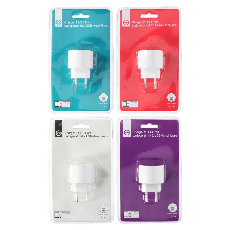 Nabíjačka do zásuvky s 2 USB portmi 2 x 1. Rôzne farebné prevedenia. Vhodné pre smartphony a tablety.