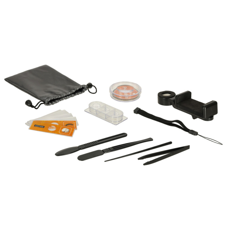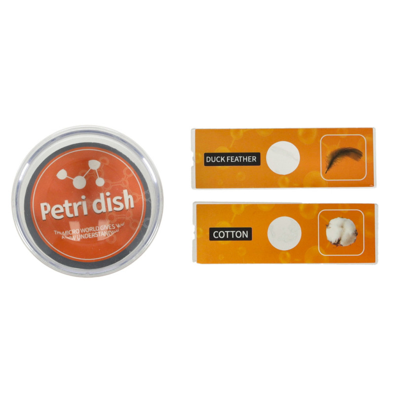 Súčasťou balenia sú 2 pripravené sklíčka so vzorkami (kačacie perie a bavlnené vlákna) a 4 prázdne sklíčka, na ktoré si deti môžu pripraviť vlastné vzorky pomocou priloženého príslušenstva.