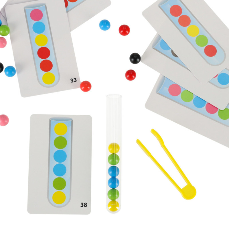 Triedenie farebných gulí do skúmavky podľa vzoru na kartičke. Dieťa môže gule triediť ručne alebo pomocou pribalených klieští.