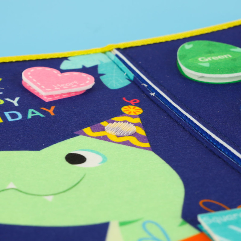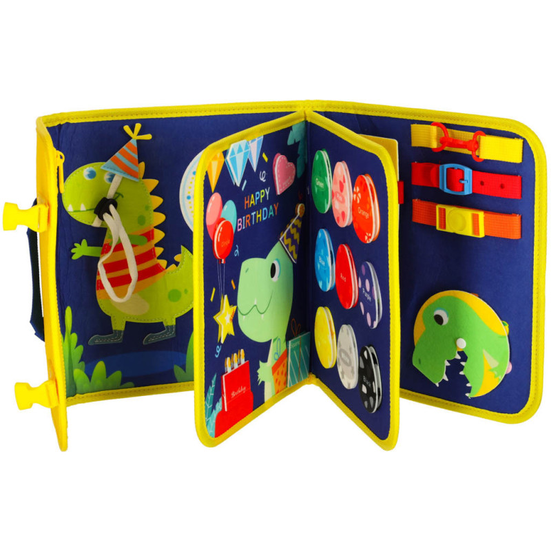 Po zložení vyzerá ako retro batôžtek so šľapkami a držadlami. Po rozložení pripomína knihu s rôznymi aktivitami: zipsy, šnúrky, klipsy, karabíny a elementy na suchý zips. Deti sa tak učia viazať šnúrky, zapínať zipsy a poznávať tvary, farby i čísla. Niektoré časti sú označené po anglicky – ideálne na prvé zoznámenie s cudzím jazykom.